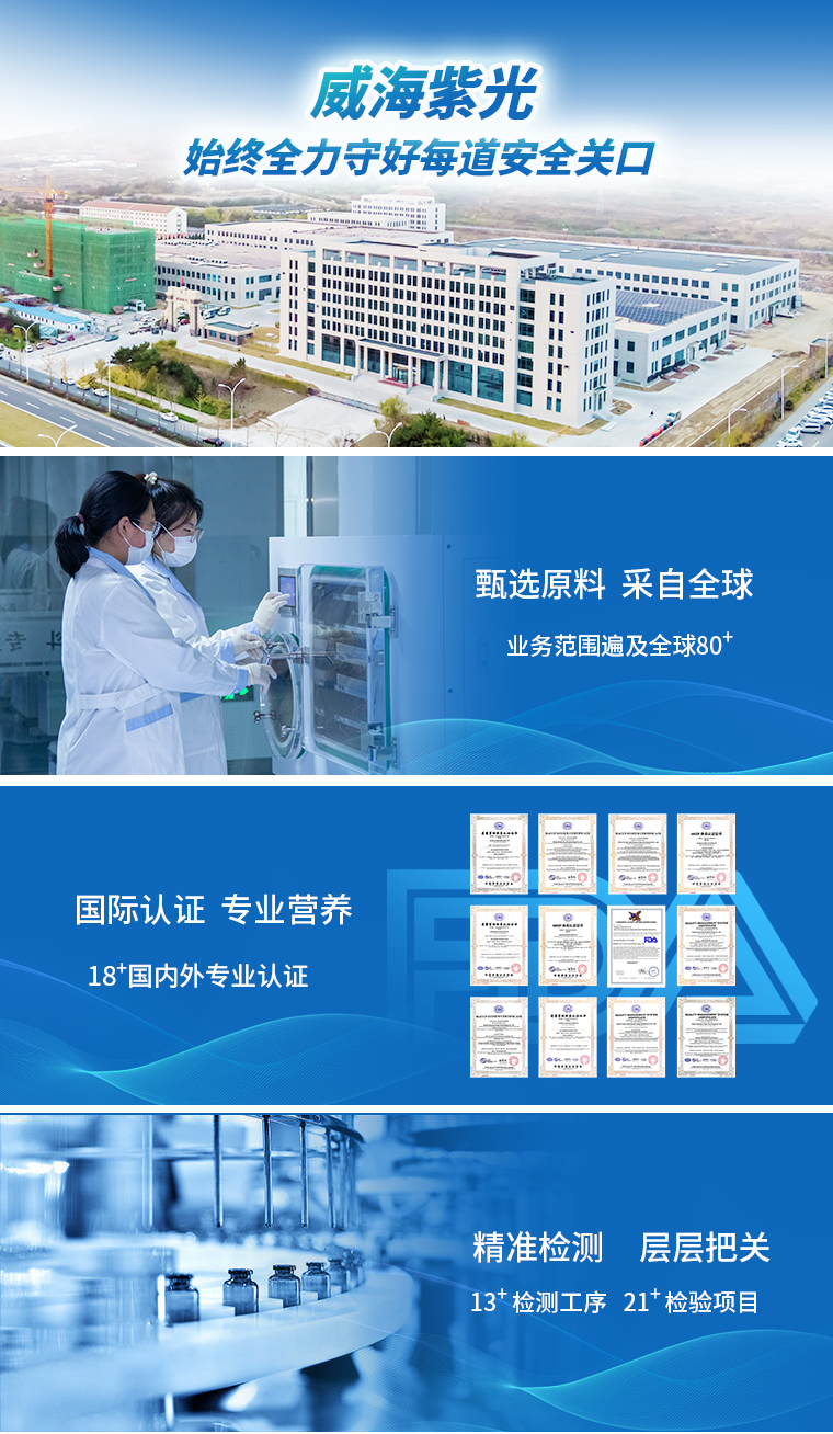 完善产品安全与质量标准管理体系,保证原料准入安全和工厂建设环境。现车间已获得美国FDA认证、GMP认证,也已取得HACCP、ISO 9001国际质量管理体系认证等多项证书,从生产工艺、生产环境到生产流程,各个环节均力求做到极致,全方位把控产品品质。